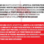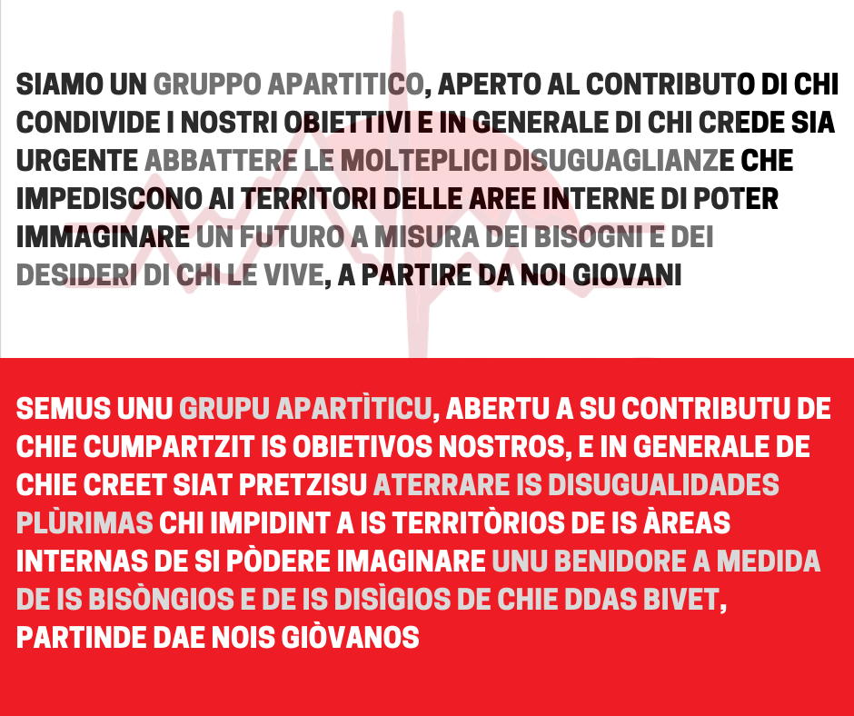 - Semus unu grupu apartìticu, abertu a su contributu de chie cumpartzit sa netzessidade de unu rilantzu de sa sanidade pùblica, e in generale de chie creet siat pretzisu aterrare is disugualidades plùrimas chi impidint a is territòrios de is àreas internas de si pòdere imaginare unu benidore a medida de is bisòngios e de is disìgios de chie ddas bivet, partinde dae nois giòvanos. Amus a lutare paris cun totu is fortzas cun is cales cumpartzimus is matessi obietivos, cun pragmatitzidade e radicalidade, sena fàghere iscontos a is contrapartes nostras.