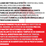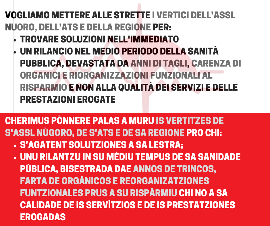 - Semus orròschidos de assistire impotentes a una situatzione chi est lesiende su deretu a sa salude de is comunidades nostras. Cherimus pònnere palas a muru is vertitzes de s’ASSL Nùgoro, de s’ATS e de sa Regione pro chi s’agatent solutziones a sa lestra, ma fintzas pro unu rilantzu in su mèdius tempus de sa sanidade pùblica, bisestrada dae annos de trincos, farta de orgànicos e reorganizatziones funtzionales prus a su rispàrmiu chi no a sa calidade de is servìtzios e de is prestatziones erogadas.