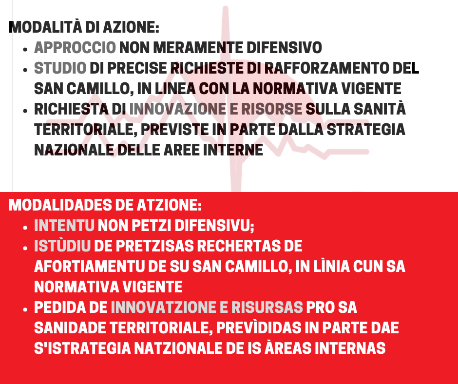 - Dd’amus a fàghere cun un’intentu non petzi difensivu, istudiende e faghende pretzisas rechestas de afortiamentu de su San Camillo – in lìnia cun su cuadru legislativu vigente, a su presente non respetadu -, pedende in s’ora innovatzione e risursas pro sa sanidade territoriale, prevìdidas in parte dae s’Istrategia Natzionale de is Àreas Internas chi dae tropu tempus abetat de partire in su territòriu nostru.